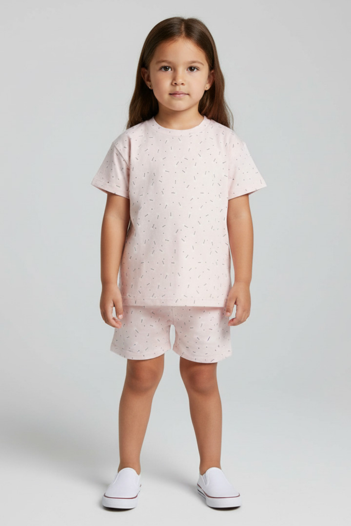 Pudra pembenin en tatlı tonu, modern ve çiçekli desenlerle buluşarak çocuğunuz için hem çok şık hem de ultra konforlu bir yaz takımı yaratıyor. Pamuklu, nefes alan yumuşacık kumaşı, çocuğunuzun hassas cildine gün boyu nazikçe dokunur ve en sıcak günlerde bile ona maksimum konfor sağlar.