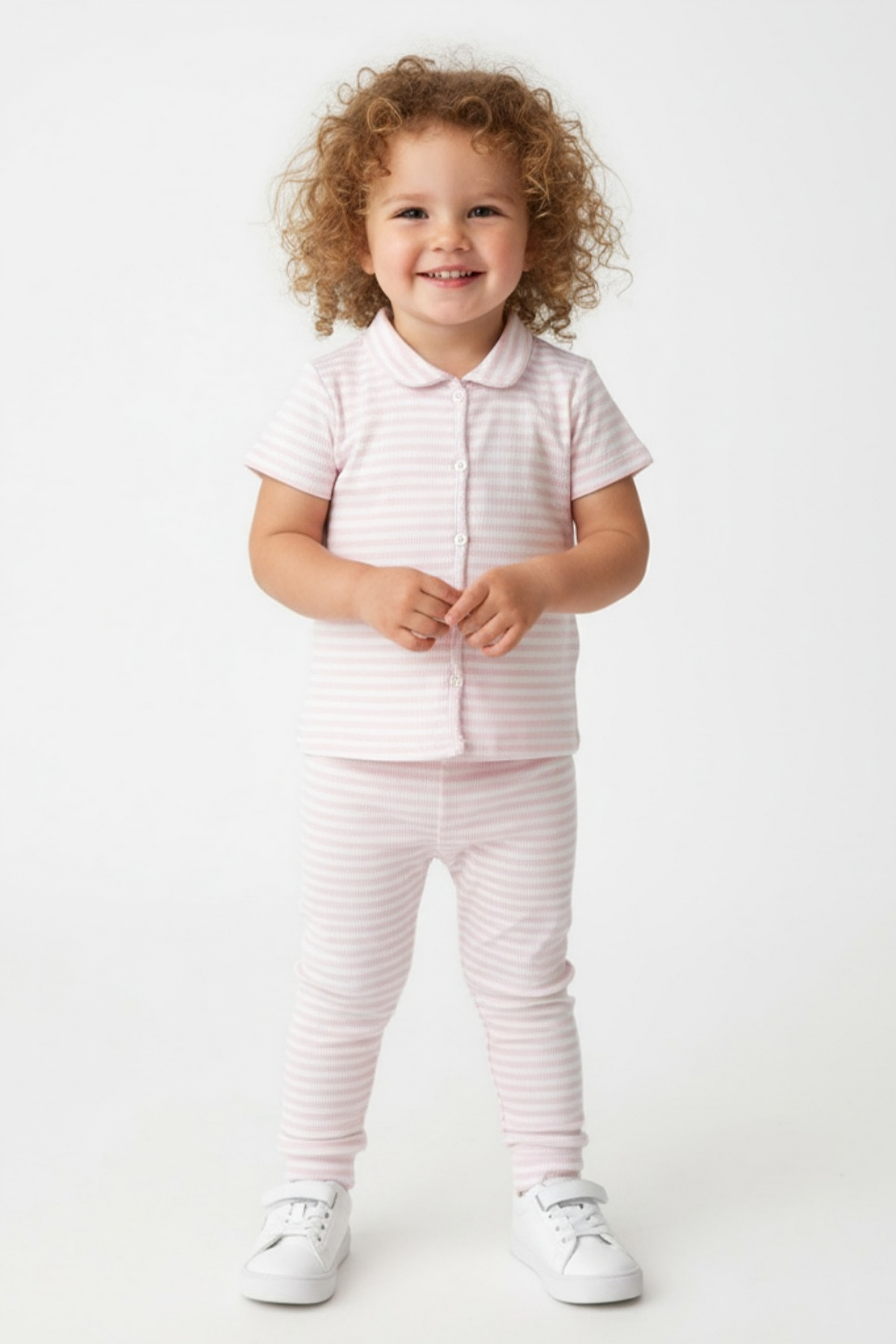 Klasik stil, modern konforla buluşuyor! Pudra pembe ve beyazın en sevimli çizgileri, esnek ve yumuşacık fitilli kaşkorse kumaş üzerinde bir araya gelerek çocuğunuz için hem zarif hem de inanılmaz rahat bir takım yaratıyor. Sevimli bebe yakası ve önden düğmeli tasarımı ile bu ikili takım, zamansız bir zarafet sunarken, çocuğunuzun gün boyu özgürce hareket etmesi için özenle tasarlandı.