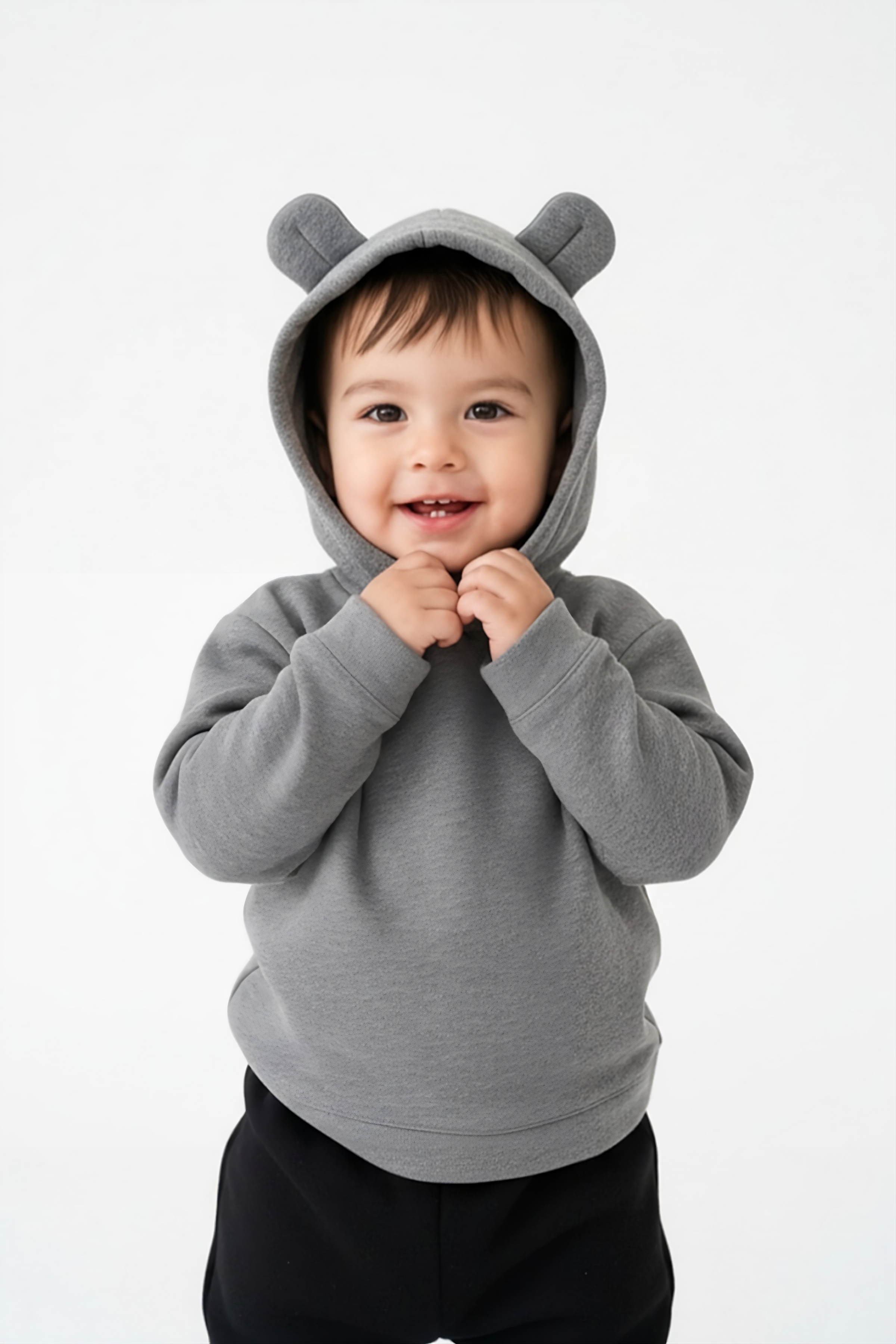 Miniklerin Sevimliliğine Sevimlilik Katan Tasarım: Ayıcık Kulaklı Kapüşonlu Gri Sweatshirt!
